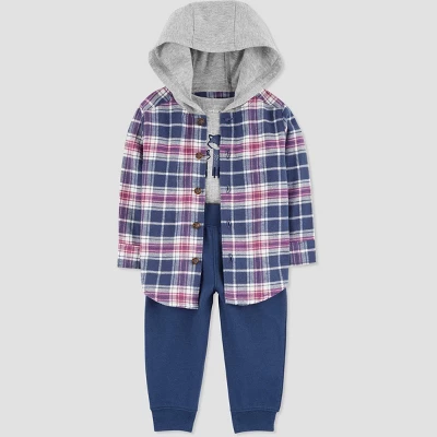 Baby boy is cozy and stylish in this Fall look by Carter’s Just One You. This 3-piece set has everything your handsome boy needs for the changing season – a hooded plaid cardigan, a long sleeve grey bodysuit and coordinating blue pants. This 3-piece baby boy outfit has cool details like a grey hood and chest graphic. He’s ready for park playdates, birthday parties, and everything in between.