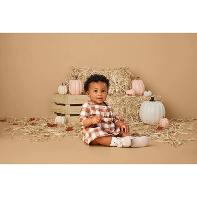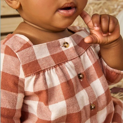 Mini style guru in the making? This Carter’s Just One You 2-piece dress set for baby girl is sure to be picture worthy. Picture her smiling in this twill brown dress with adorable gingham pattern as she wiggles or crawls around with the coordinating diaper cover! All she’s missing is her lettuce trim socks or Fall booties to complete this ultra-chic Fall look for baby girl.