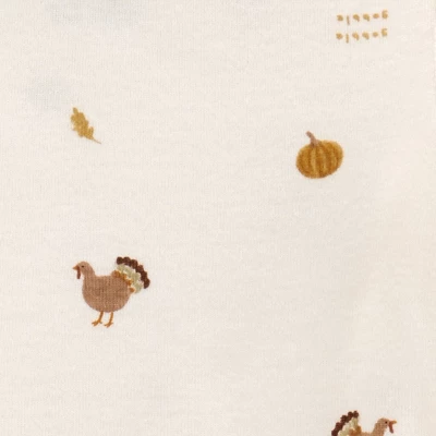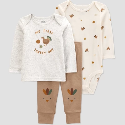 This Carter’s Just One You Thanksgiving 3-piece outfit set for baby lets the world know it’s “my first turkey.” Including one turkey print bodysuit with overlap shoulders, one long-sleeve t-shirt with turkey graphic plus one pair of soft stretchy pants with turkey appliques on the knees, your little one has a complete holiday look! This holiday 3-piece outfit set for baby is made with the quality you trust and love from Carter’s brand. Pick up this Thanksgiving outfit for your baby or as a gift for the newest little turkey in the family!