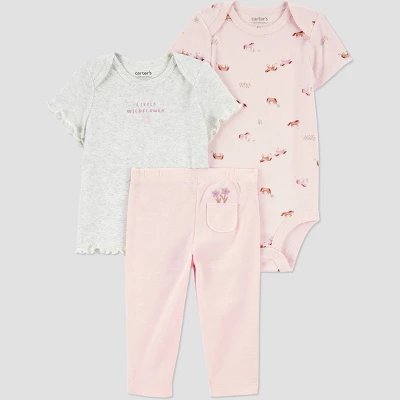 Baby’s first year is filled with style and cuddles in this 3-piece layette set from Carter’s Just One You. Featuring one bodysuit, one short-sleeve t-shirt, and matching pants for baby girl– this set is made for easy dressing on busy days! In this comfy set for baby your little one is comfortable and cute no matter what is on the schedule!