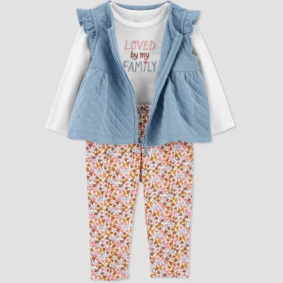 Made from Just One You by Carter’s, this set has every parent’s convenience in mind. To start, there’s a quilted vest with fluttery detail and a perfectly matching bottom. Then, to tie it together, there’s a neutral bodysuit with snaps where it counts. This set has everything you need to complete baby girl’s look of the day – no hassle, all charm. This floral set is both essential and so baby-friendly.